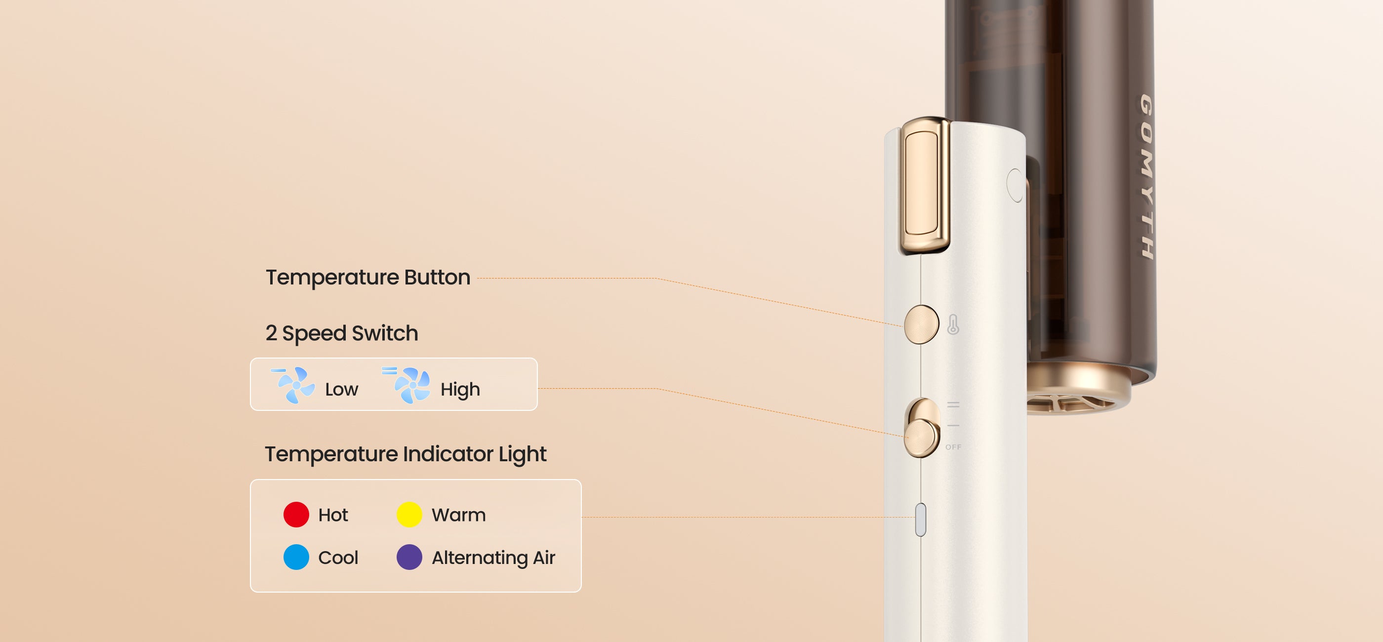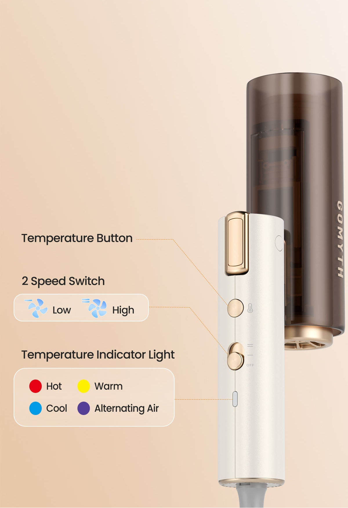 Temperature Settings: Cool Air, Warm Air, Hot Air, Alternating Hot and Cool Air